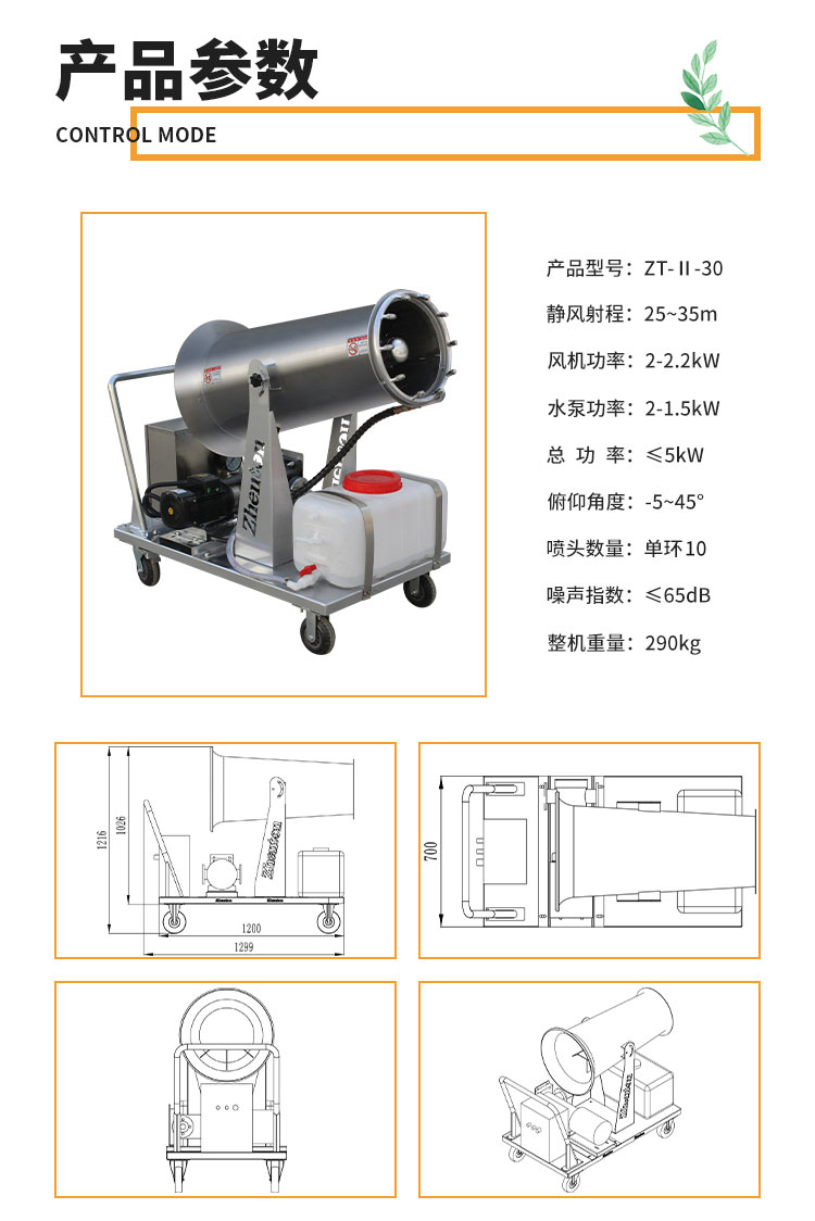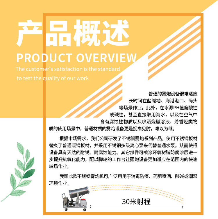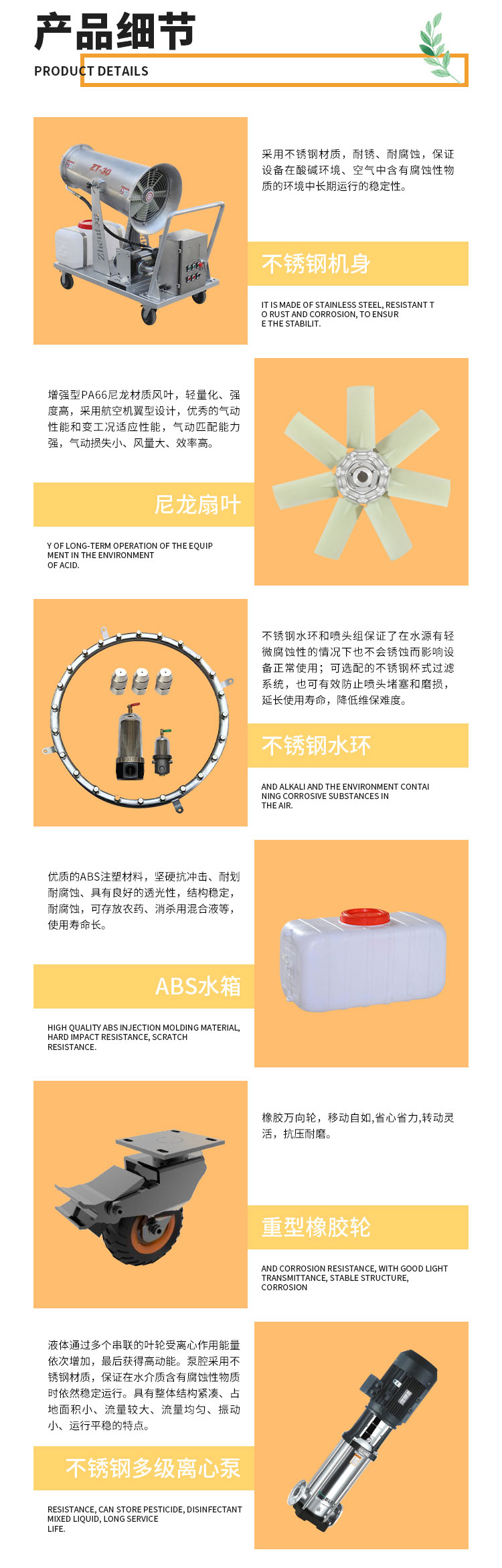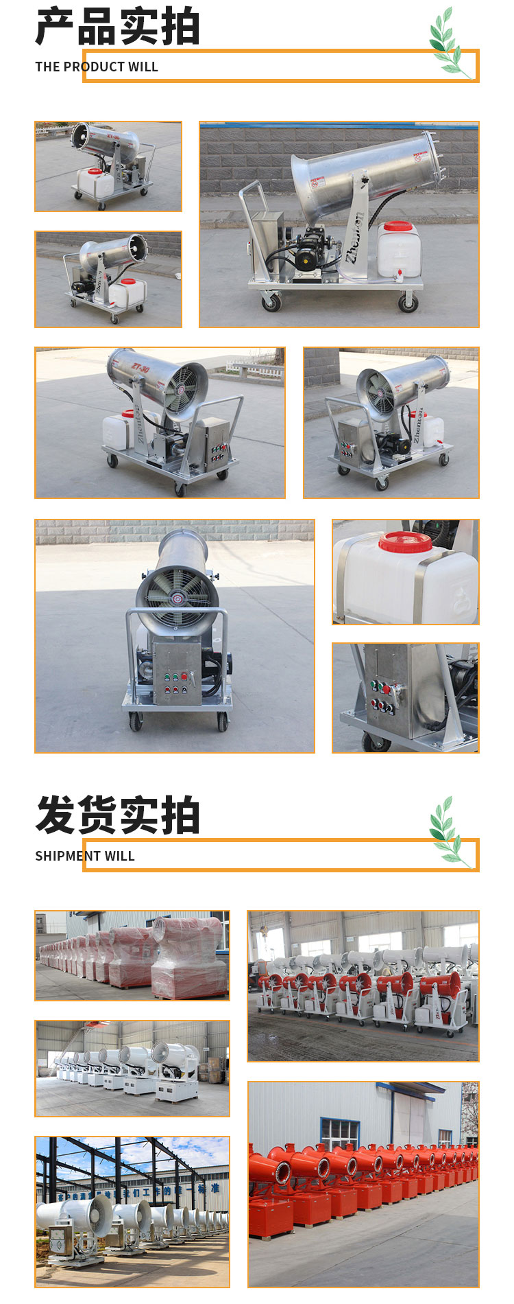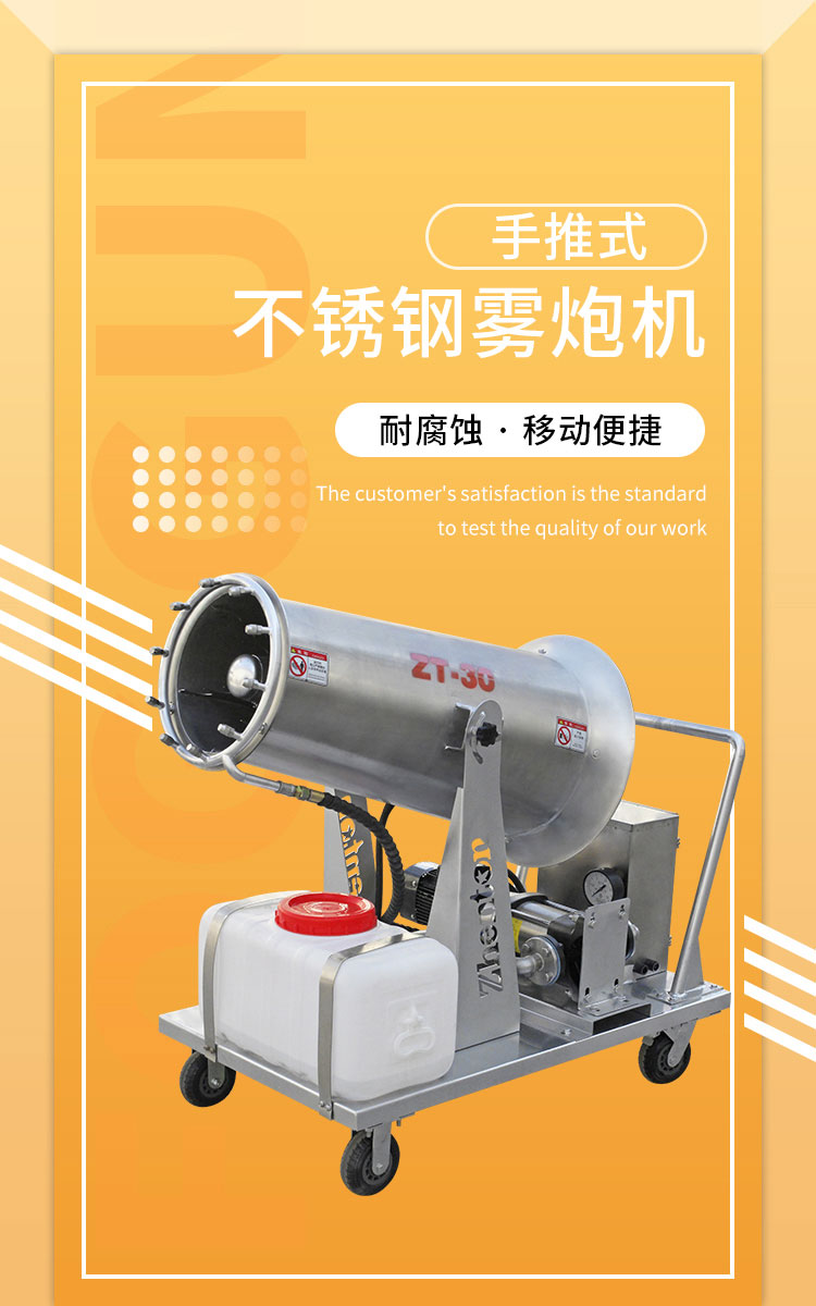 產品特點:30米手推式不銹鋼霧炮機有天然的耐銹、耐腐蝕能力,其它部件可噴涂環氧樹脂防腐涂層進一步提升抗氧化能力,配以腳輪的工作臺讓霧炮設備更加適應在范圍內的快速轉場作業。