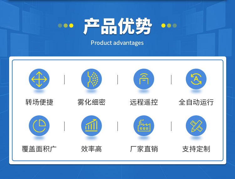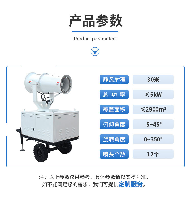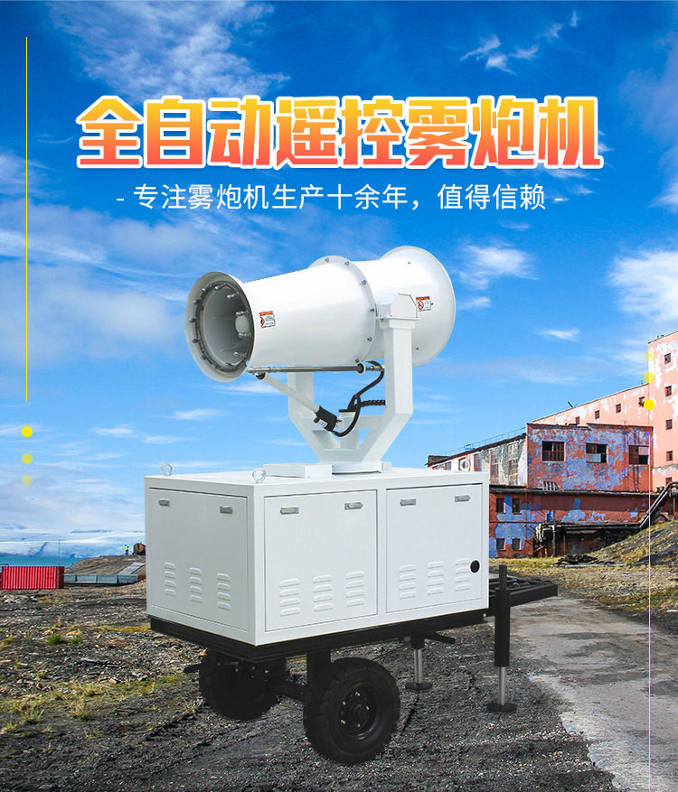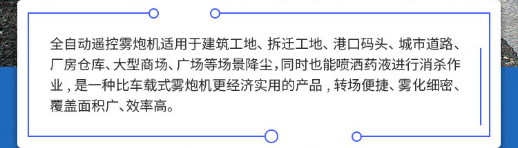 產品特點:30米遙控全自動霧炮機射程遠、機動性能好、使用便捷,支持遙控和人工控制操作。