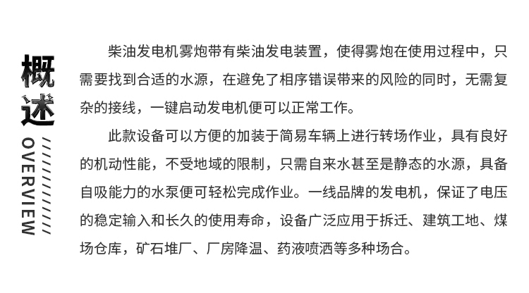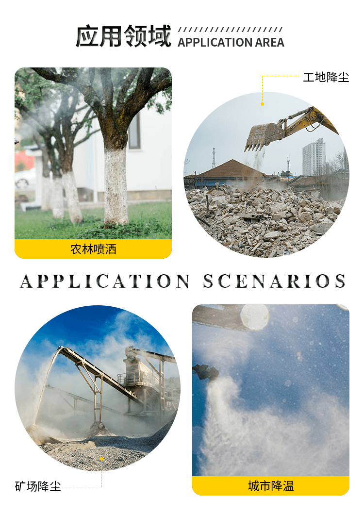 主要用途:建筑工地 煤場,礦場、料場、碼頭工業(yè)除塵,農(nóng)業(yè),園林綠化等飛機(jī)場、高速公路、車站、碼頭、公共場所、運動場地、炎熱場地等降塵保濕降溫消毒。