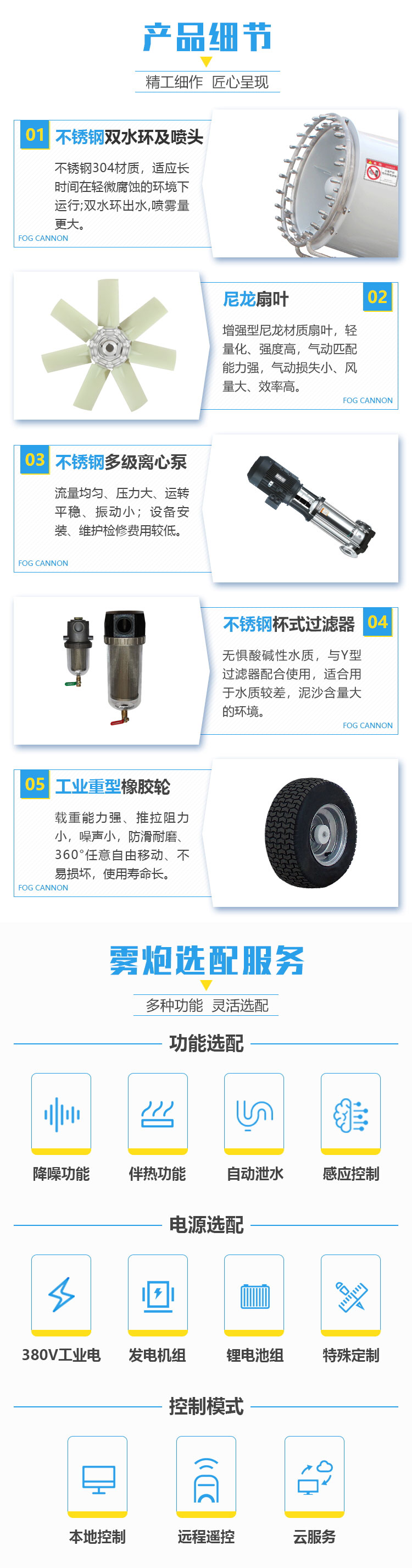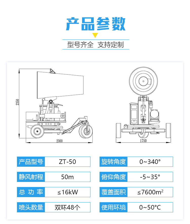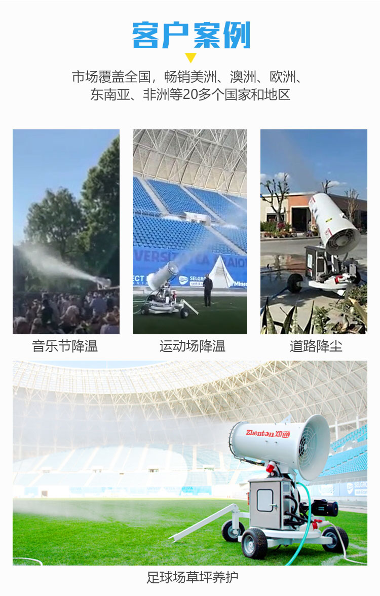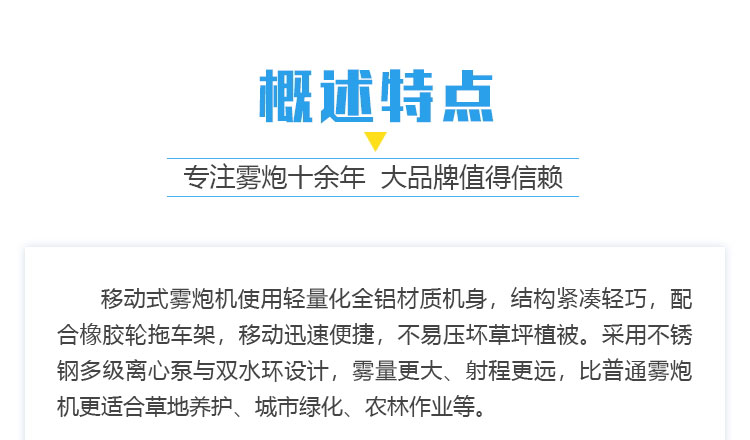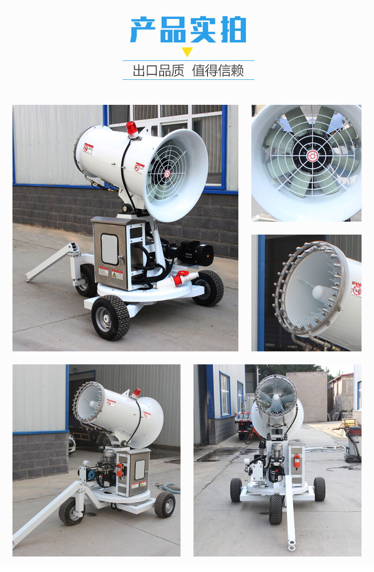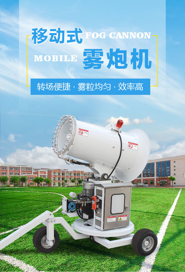 產(chǎn)品特點:50米移動式霧炮機使用輕量化全鋁材質(zhì)機身,結(jié)構(gòu)緊湊輕巧,大大降低了設(shè)備自重,再配合橡膠輪拖車架,移動迅速便捷,不易壓壞草坪、植被。采用不銹鋼多級離心泵與雙水環(huán)設(shè)計,霧量更大、覆蓋廣泛。