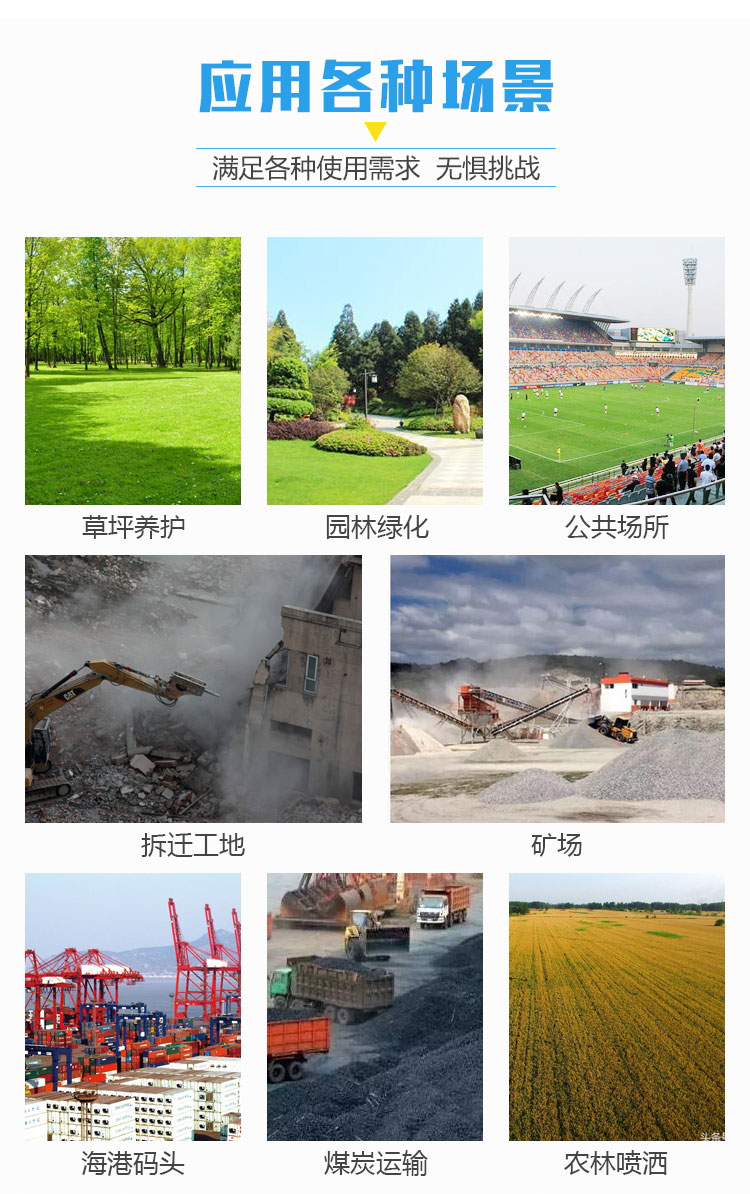 主要用途:城市拆遷工地、冶金鋼鐵企業(yè)、采礦區(qū)域、煤化工企業(yè)、水泥廠、火力發(fā)電廠、建筑工地、物料和礦產(chǎn)品露天堆放廠、混凝土處理廠、垃圾堆放場、垃圾焚燒廠、沙廠、干式物料倉庫、露天爆破、重度粉塵區(qū)域。