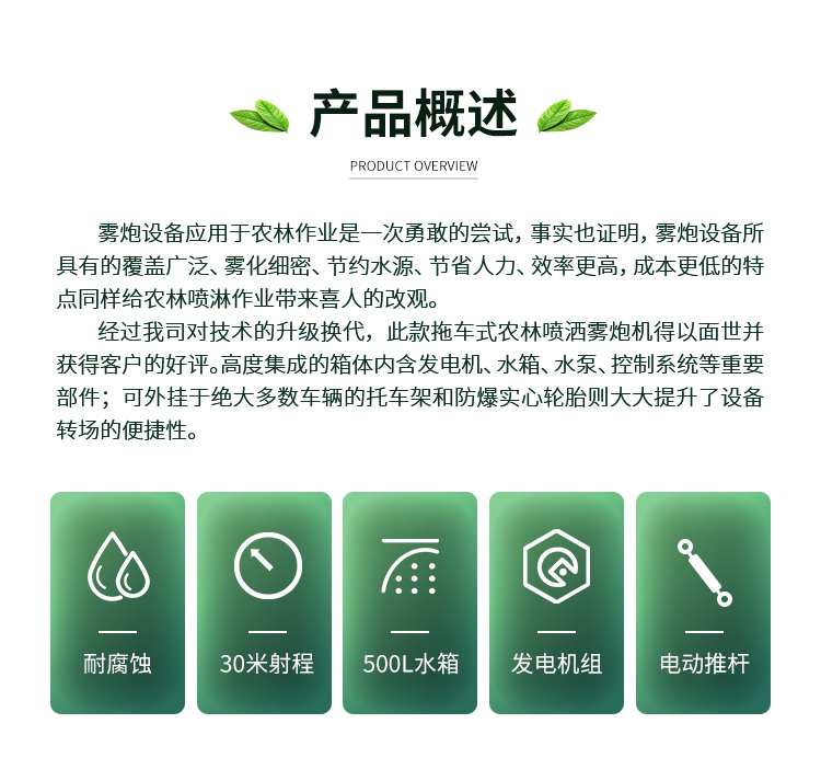 產品特點:鄭通30米拖車式農藥噴灑霧炮機,靜風射程25-30米左右,搭配500L的水箱,配備發電機,具有耐腐蝕,射程遠,移動便捷,噴霧范圍廣泛等特點,備受農田果園打藥,綠植噴霧養護,城市道路降溫除塵等場景的歡迎!